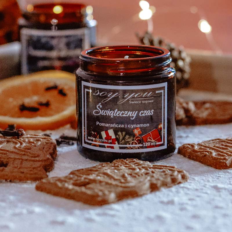 Świeca sojowa Świąteczny czas to cudowny zimowy zapach. Dojrzała pomarańcza z nutą cynamonu pachną bliskością rodzinnego spotkania.