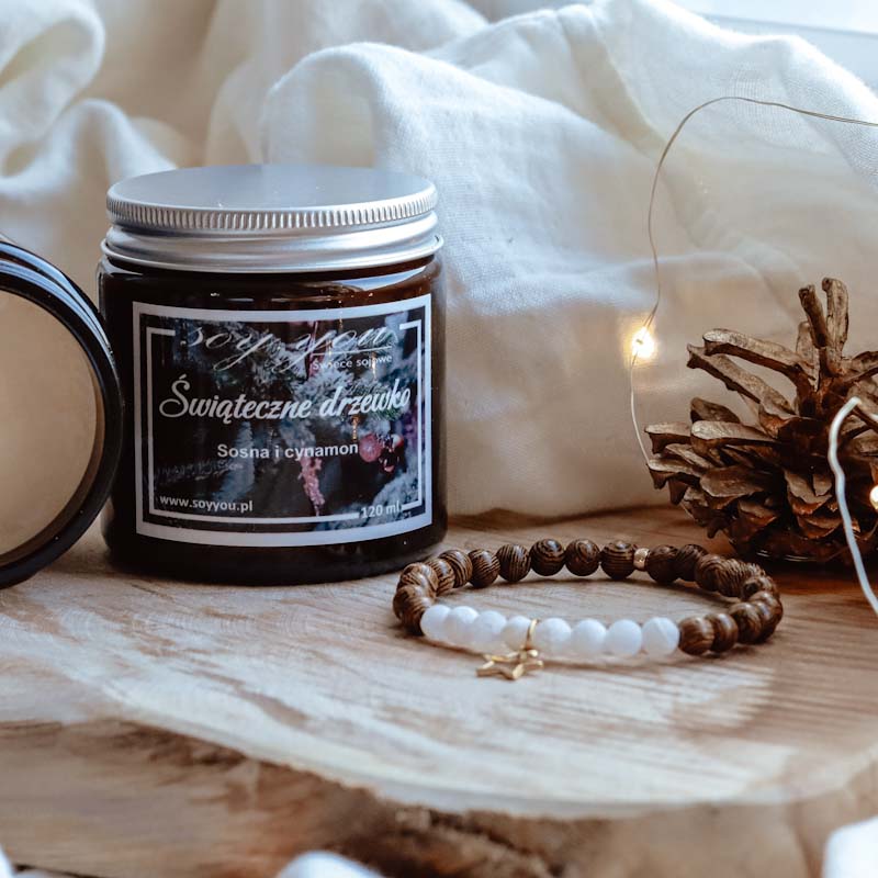 Świeca sojowa Świąteczne drzewko to drzewny zapach świerkowych igieł z cynamonem i nutką wanilii. Niezwykle orzeźwiający i świeży zapach działa kojąco i rozluźniająco.