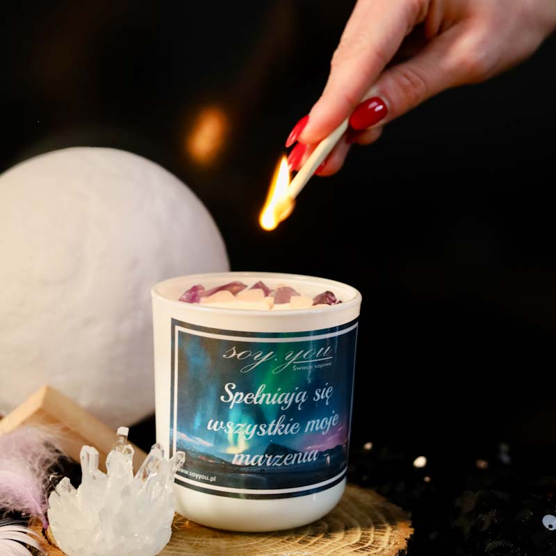 Świeca sojowa Spełniają się wszystkie moje marzenia pomoże Ci w realizacji Twoich marzeń i życzeń. Nasza świeca sojowa została stworzona z myślą o medytacji i afirmacji, dzięki czemu możesz uzyskać pełen relaks i skupić się na swoich celach. Metoda zdmuchnięcia świecy i wypowiedzenia życzenia jest prosta i skuteczna. Po zapaleniu świecy, pozwól sobie na chwilę relaksu i skupienia, a następnie zdmuchnij płomień i wypowiedz swoje życzenie. Dzięki połączeniu naturalnych składników, takich jak wosk sojowy i olejki zapachowe, nasza świeca pozwoli Ci na odprężenie i skupienie w momencie medytacji. Wierzymy, że nasza świeca sojowa jest idealnym narzędziem do uzyskania spokoju i wewnętrznej harmonii, a także do skutecznego realizowania swoich celów. Wypróbuj ją już dzisiaj i ciesz się jej relaksującym i kojącym działaniem! Zapach świecy – gardenia, tuberoza, piżmo, granat. Czas palenia ok. 50 godzin