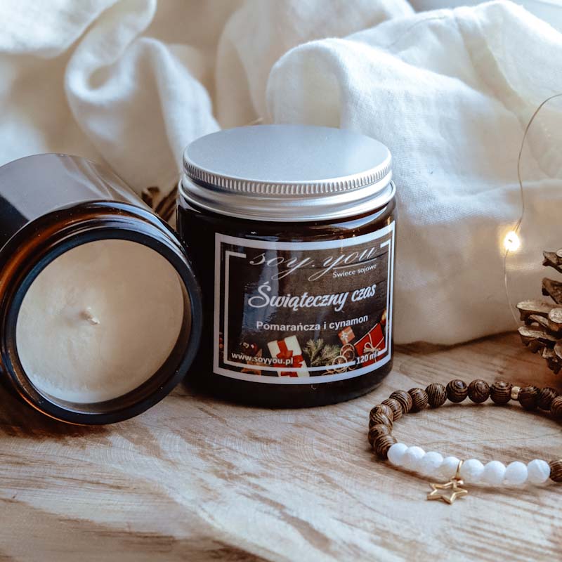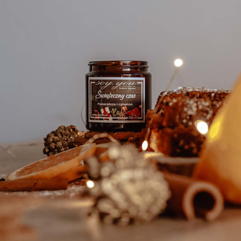 Świeca sojowa Świąteczny czas to cudowny zimowy zapach. Dojrzała pomarańcza z nutą cynamonu pachną bliskością rodzinnego spotkania.